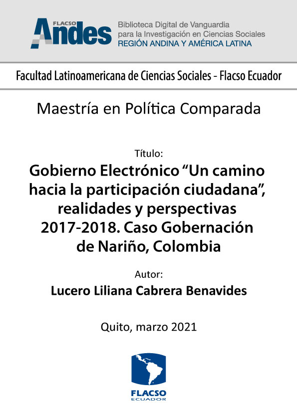 Cabrera Benavides, Lucero Liliana. 2021. Gobierno Electrónico “Un camino hacia la participación ciudadana”, realidades y perspectivas 2017-2018. Caso Gobernación de Nariño, Colombia. Tesis de maestría, Flacso Ecuador.