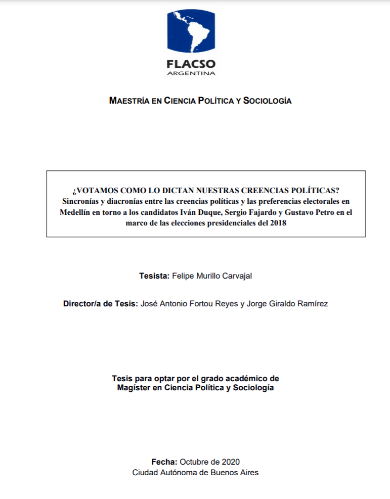 Murillo Carvajal, Felipe. (2020). ¿Votamos como lo dictan nuestras creencias políticas? : sincronías y diacronías entre las creencias políticas y las preferencias electorales en Medellín en torno a los candidatos Iván Duque, Sergio Fajardo y Gustavo Petro en el marco de las elecciones presidenciales del 2018. Tesis de Maestría. FLACSO. Sede Académica Argentina, Buenos Aires.