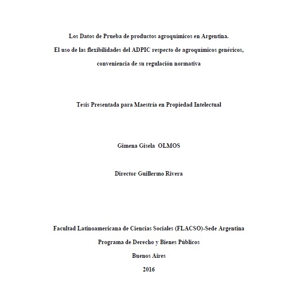 Olmos, Gimena Gisela (2017). Los datos de prueba de productos agroquímicos en Argentina : el uso de las flexibilidades del ADPIC respecto de agroquímicos genéricos, conveniencia de su regulación normativa. Tesis de Maestría. FLACSO. Sede Académica Argentina, Buenos Aires.