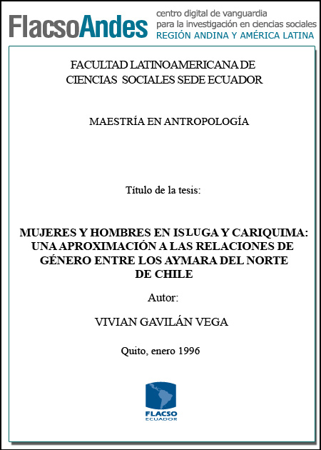 Gavilán Vega, Vivian (1996). Mujeres y hombres en Isluga y Cariquima : una aproximación a las relaciones entre los Aymara del norte de Chile. Maestría en Antropoogía. FLACSO sede Ecuador. Chile. 139 p.