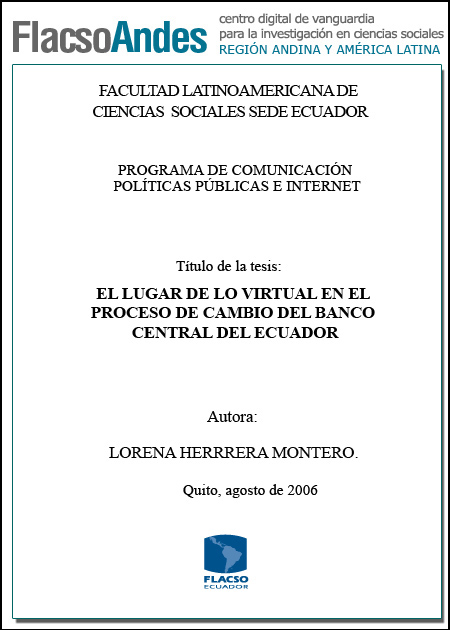Herrera Montero, Lorena (2006). El lugar de lo virtual en el proceso de cambio del Banco Central del Ecuador: de las reformas estructurales a la dolarización. Maestría Andina en Comunicación Políticas Públicas e Internet. FLACSO - Sede Ecuador. Quito. 144 p.