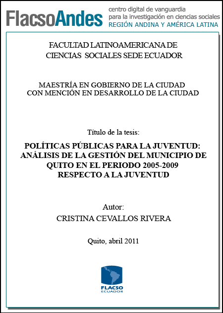 Cevallos Rivera, Cristina. 2011. Políticas públicas para la juventud: análisis de la gestión del Municipio de Quito en el período 2005 - 2009 respecto a la juventud. Tesis de maestría, Flacso Ecuador.