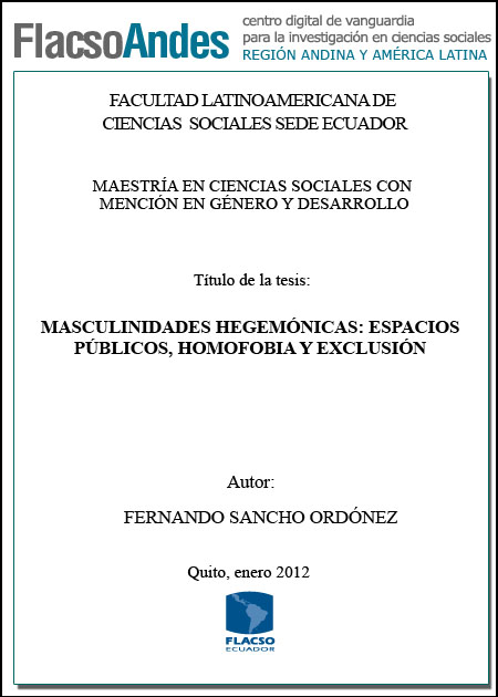 Sancho Ordónez, Fernando (2012). Masculinidades hegemónicas : espacios públicos, homofobia y exclusión. Maestría en Ciencias Sociales con mención en Género y Desarrollo; FLACSO - Sede Ecuador. Quito. 103 p.