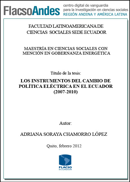 Chamorro López, Adriana Soraya (2012). Los instrumentos del cambio de política eléctrica en el Ecuador (2007-2010). Maestría en Ciencias Sociales con mención en Gobernanza Energética; FLACSO - Sede Ecuador. Quito. 120 p.