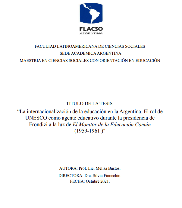 Bustos, Melisa Mariana. (2021). La internacionalización de la educación en la Argentina : el rol de UNESCO como agente educativo durante la presidencia de Frondizi a la luz de El Monitor de la Educación Común (1959-1961). Tesis de Maestría. FLACSO. Sede Académica Argentina, Buenos Aires.