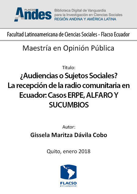 Dávila Cobo, Gissela Maritza. 2018. ¿Audiencias o Sujetos Sociales? La recepción de la radio comunitaria en Ecuador: Casos ERPE, ALFARO Y SUCUMBIOS. Tesis de maestría, Flacso Ecuador.