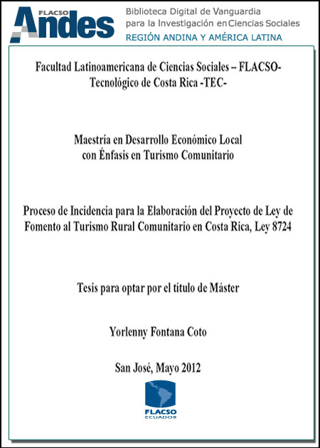 Fontana, Y. (2012). Proceso de incidencia para la elaboración del Proyecto de Ley de Fomento al Turismo Rural Comunitario en Costa Rica, Ley 8724 (Tesis de Maestría en Desarrollo Económico Local con énfasis en Turismo Comunitario). FLACSO Sede Costa Rica, San José.