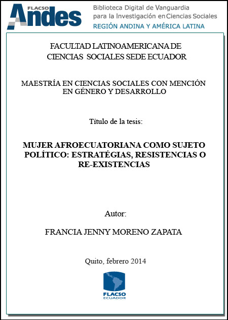 Moreno Zapata, Francia Jenny. 2014. Mujer afroecuatoriana como sujeto político: Estrategias, resistencias o re-existencias. Tesis de maestría, FLACSO Sede Ecuador.