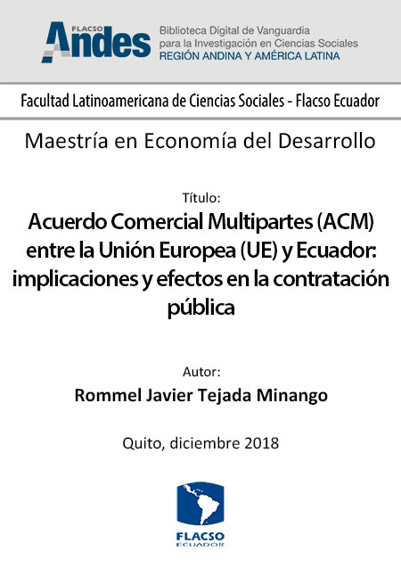 Tejada Minango, Rommel Javier. 2018. Acuerdo Comercial Multipartes (ACM) entre la Unión Europea (UE) y Ecuador: implicaciones y efectos en la contratación pública. Tesis de maestría, Flacso Ecuador.