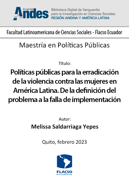 Saldarriaga Yepes, Melissa. 2023. Políticas públicas para la erradicación de la violencia contra las mujeres en América Latina. De la definición del problema a la falla de implementación. Tesis de maestría, Flacso Ecuador.