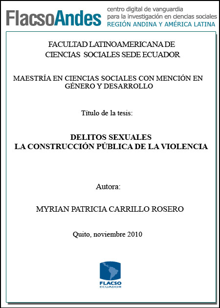 Carrillo Rosero, Myriam Patricia (2010). Delitos sexuales la construcción pública de la violencia. Maestría en Ciencias Sociales con mención en Género y Desarrollo; FLACSO - Sede Ecuador. Quito. 84 p.