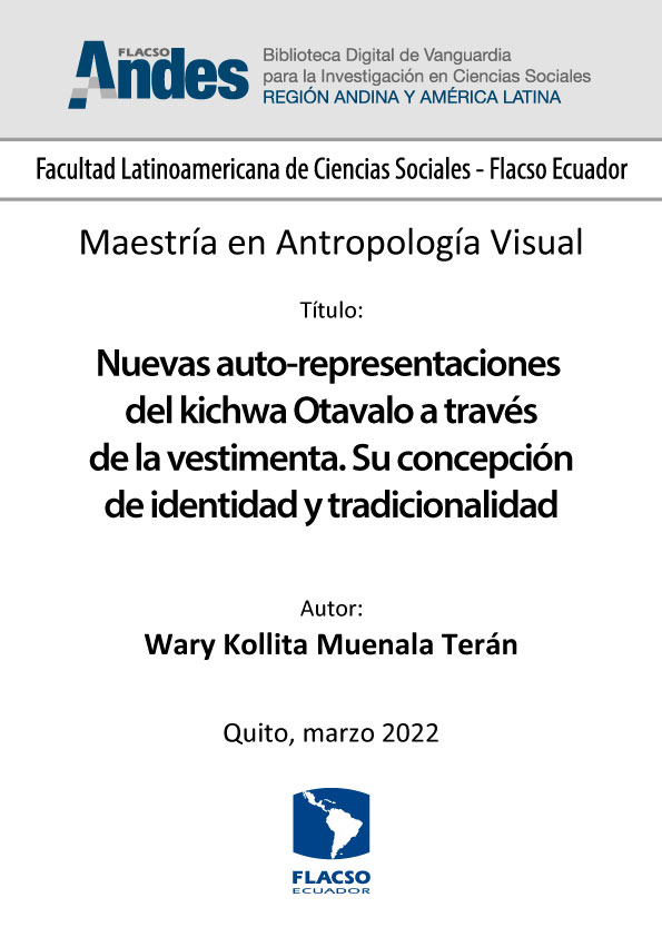 Muenala Terán, Wary Kollita. 2022. Nuevas auto-representaciones del kichwa Otavalo a través de la vestimenta. Su concepción de identidad y tradicionalidad. Tesis de maestría, Flacso Ecuador.