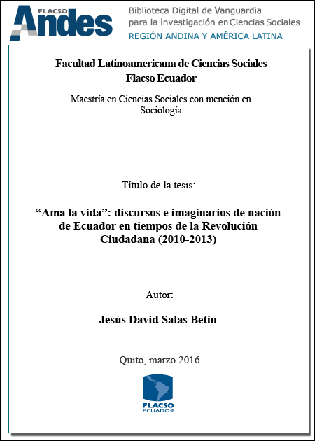 Salas Betin, Jesús David. 2016. "Ama la vida”: discursos e imaginarios de nación de Ecuador en tiempos de la Revolución Ciudadana (2010-2013). Tesis de maestría, Flacso Ecuador.