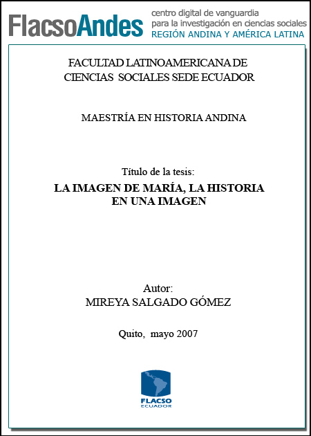 Salgado Gómez, Mireya (1997). La imagen de María, la historia de una imagen. Maestría en Historia Andina, FLACSO Sede Ecuador. Quito. 105 p.