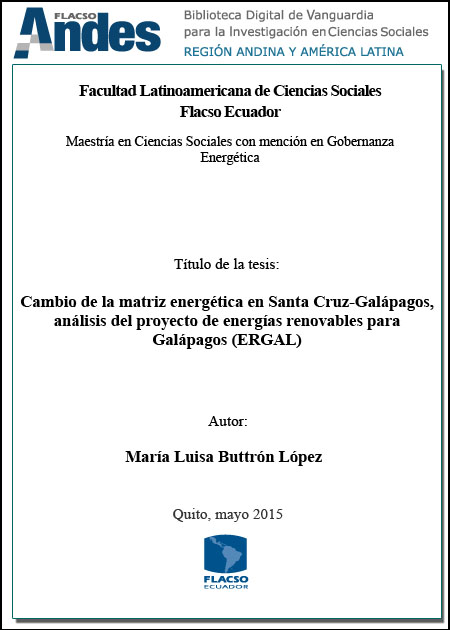 Buitrón López, María Luisa. 2015. Cambio de la matriz energética en Santa Cruz – Galápagos, análisis del proyecto de energías renovables para Galápagos (ERGAL). Tesis de maestría, Flacso Ecuador.