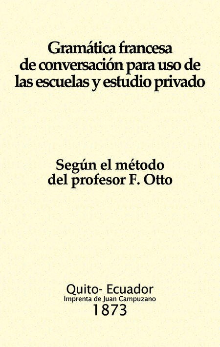 Wenzel A, S. J. 1873. Gramática francesa de conversación para uso de las escuelas y estudio privado, según el método del profesor F. Otto Aplicado al español por A. Wenzel S. J. Quito, Ecuador : Imprenta de Juan Campuzano.