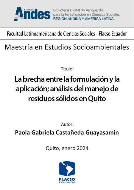 Castañeda Guayasamin, Paola Gabriela. 2024. La brecha entre la formulación y la aplicación; análisis del manejo de residuos sólidos en Quito. Tesis de maestría, Flacso Ecuador.