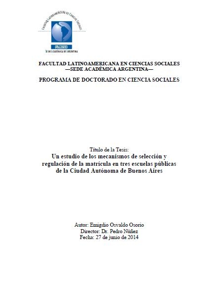 Osorio, Emigdio Osvaldo (2015). Un estudio de los mecanismos de selección y regulación de la matrícula en tres escuelas públicas de la Ciudad Autónoma de Buenos Aires. Tesis de Doctorado. FLACSO. Sede Académica Argentina, Buenos Aires.