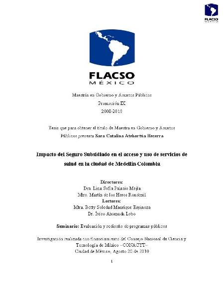 Atehortúa Becerra, Sara Catalina (2010). Impacto del seguro subsidiado en el acceso y el uso de servicios de salud en la ciudad de Medellín-Colombia. Maestría en Gobierno y Asuntos Públicos; FLACSO México. México. 106 h.