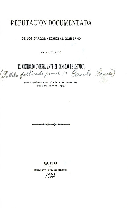 Refutación documentada de los cargos hechos al Gobierno en el folleto "El Contrato de D'Oksza ante el Consejo de Estado" : (del "Periódico Oficial" núm. extraordinario del 6 de junio de 1892). 1892. Quito, Ecuador : Imprenta del Gobierno.