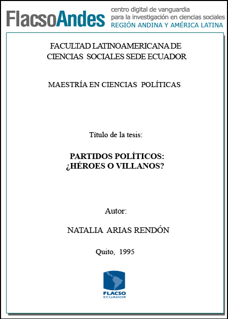 Arias Rendón, Natalia (1995), Partidos políticos: ¿héroes o villanos?. Maestría en Ciencias Políticas; FLACSO sede Ecuador. Quito. 77 P.