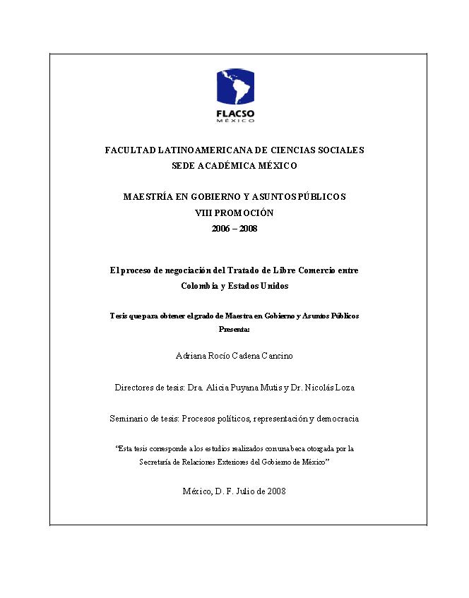 Cadena Cancino, Adriana Rocío (2008). El proceso de negociación del Tratado de Libre Comercio entre Colombia y Estados Unidos. Maestría en Gobierno y Asuntos Públicos; FLACSO - Sede Académica de México. México. 154 h.