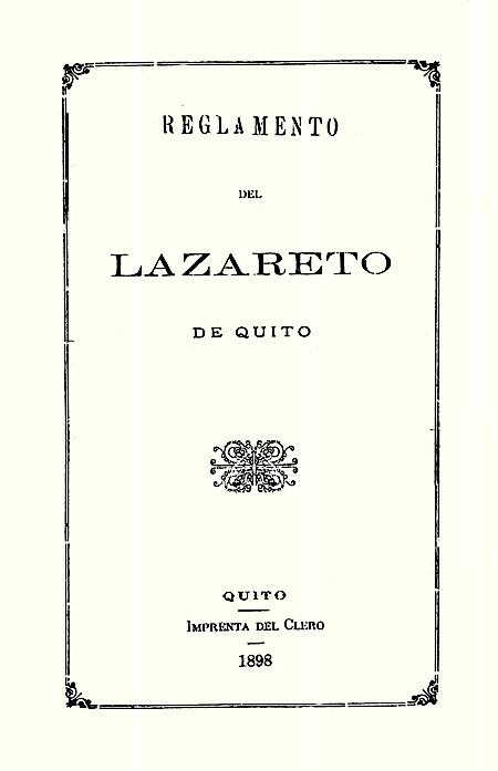 Hospital de San Lázaro. 1898. Reglamento del Lazareto de Quito. Quito, Ecuador : Imprenta del Clero.