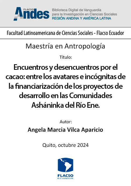 Vilca Aparicio, Angela Marcia. 2024. Encuentros y desencuentros por el cacao: entre los avatares e incógnitas de la financiarización de los proyectos de desarrollo en las Comunidades Asháninka del Río Ene. Tesis de maestría, Flacso Ecuador.