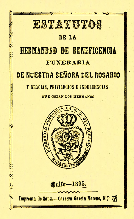 Hermandad de Beneficencia Funeraria. 1895. Estatutos de la Hermandad de la Funeraria de Nuestra Señora del Rosario y gracias, privilegios e indulgencias que gozan los hermanos. Quito, Ecuador : Imprenta de Sanz.