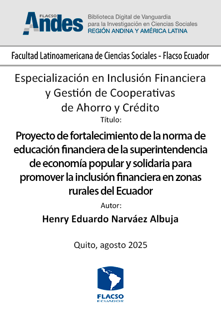 Narváez Albuja, Henry Eduardo. 2025. Proyecto de fortalecimiento de la norma de educación financiera de la superintendencia de economía popular y solidaria para promover la inclusión financiera en zonas rurales del Ecuador. Tesina de especialización, Flacso Ecuador.