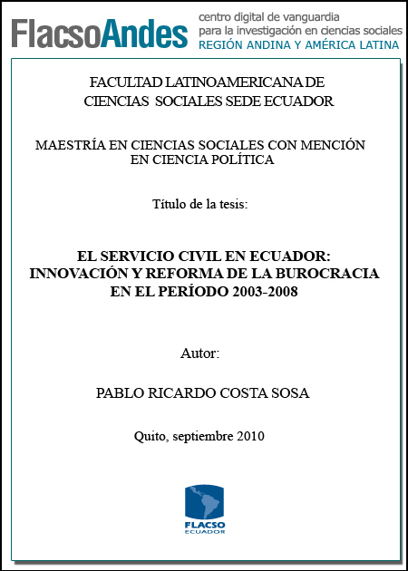 Costa Sosa, Pablo Ricardo (2010). El servicio civil en Ecuador : innovación y reforma de la burocracia en el período 2003 - 2008. Maestría en Ciencias Sociales con mención en Ciencia Política; FLACSO Sede Ecuador. Quito. 142 p.