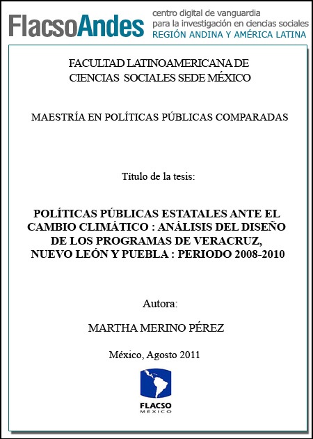 Merino Pérez, Martha (2011). Políticas públicas estatales ante el cambio climático : análisis del diseño de los programas de Veracruz, Nuevo León y Puebla : periodo 2008-2010. Maestría en Políticas Públicas Comparadas; FLACSO México. México. 136 h.