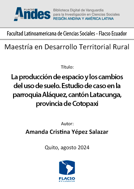 Yépez Salazar, Amanda Cristina. 2024. La producción de espacio y los cambios del uso de suelo. Estudio de caso en la parroquia Aláquez, cantón Latacunga, provincia de Cotopaxi. Tesis de maestría, Flacso Ecuador.