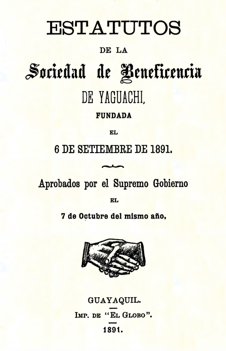 Estatutos de la Sociedad de Beneficencia de Yaguachi fundada el 6 de septiembre de 189. Aprobados por el Supremo Gobierno el 7 de octubre del mismo año.
