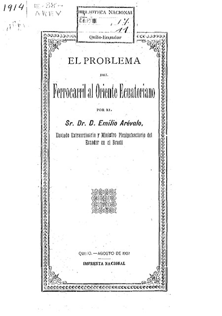Arévalo, Emilio. 1907. El Problema del Ferrocarril al Oriente Ecuatoriano por el Sr. Dr. D. Emilio Arévalo, enviado extraordinario y Ministro Plenipotenciario del Ecuador en Brasil. Quito : Imprenta Nacional