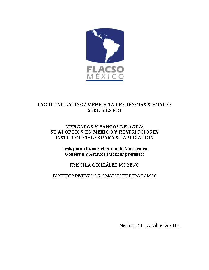 González Moreno, Priscila (2008). Mercados y bancos de agua : su adopción en México y restricciones institucionales para su aplicación. Maestría en Gobierno y Asuntos Públicos; FLACSO - Sede Académica de México. México. 177 h.