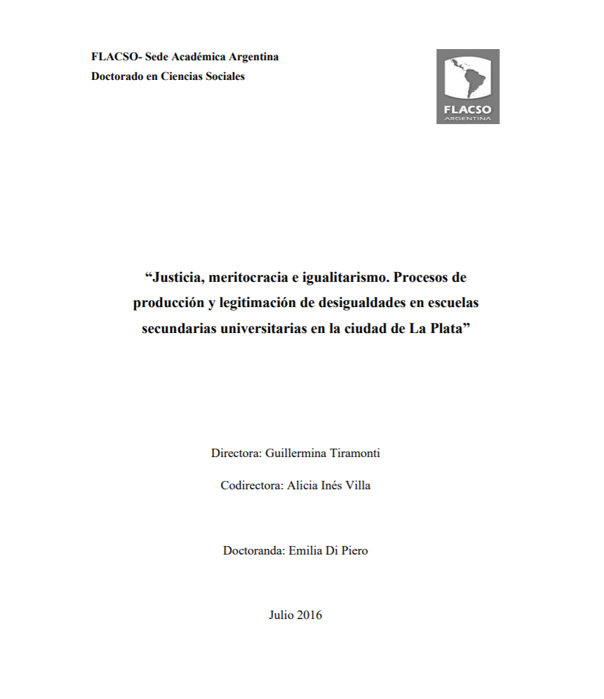 Di Piero, María Emilia. (2016). Justicia, meritocracia e igualitarismo : procesos de producción y legitimación de desigualdades en escuelas secundarias universitarias en la ciudad de La Plata. Tesis de Doctorado. FLACSO. Sede Académica Argentina, Buenos Aires.