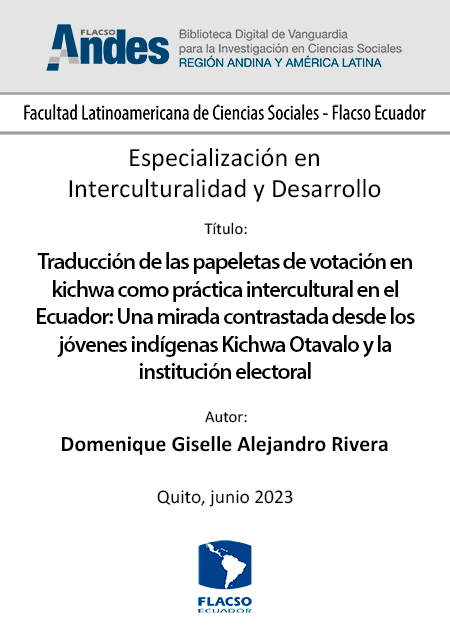 Alejandro Rivera, Domenique Giselle. 2023. Traducción de las papeletas de votación en kichwa como práctica intercultural en el Ecuador: Una mirada contrastada desde los jóvenes indígenas Kichwa Otavalo y la institución electoral. Tesina de especialización, Flacso Ecuador.