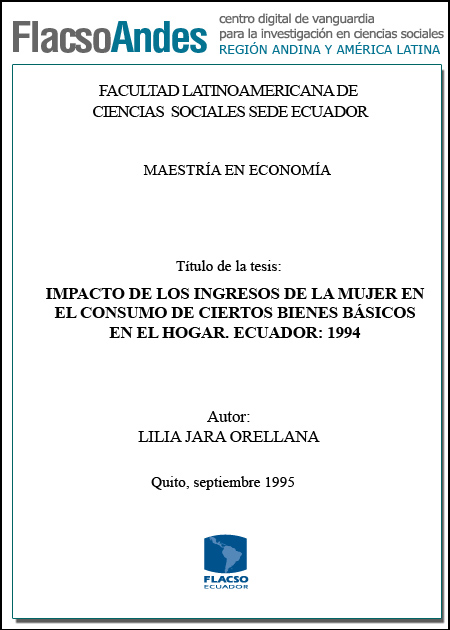 Jara Orellana, Lilia (1995). Impacto de los ingresos de la mujer en el consumo de ciertos bienes básicos en el hogar, Ecuador 1994. Maestría en Economía; FLACSO - Sede Ecuador. Quito. 80 p.