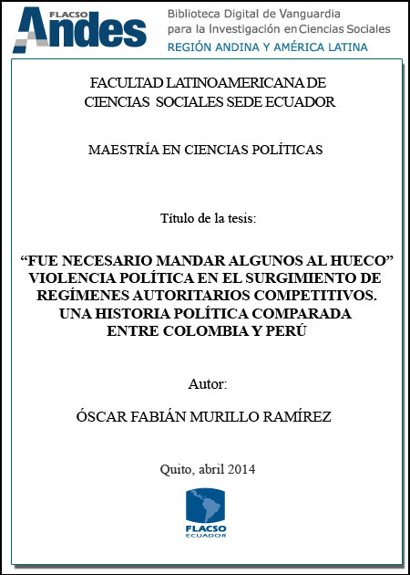 Murillo Ramírez, Óscar Fabián. 2014. Fue necesario mandar algunos al hueco: Violencia política en el surgimiento de regímenes autoritarios competitivos. Una historia política comparada de Colombia y Perú. Tesis de maestría, FLACSO Sede Ecuador.