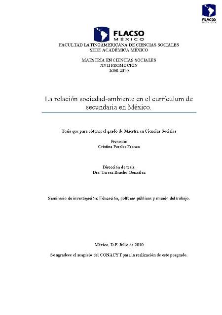 Perales Franco, Cristina (2010). La relación sociedad-ambiente en el currículum de la secundaria en México. Maestría en Ciencias Sociales; FLACSO México. México. 193 h.
