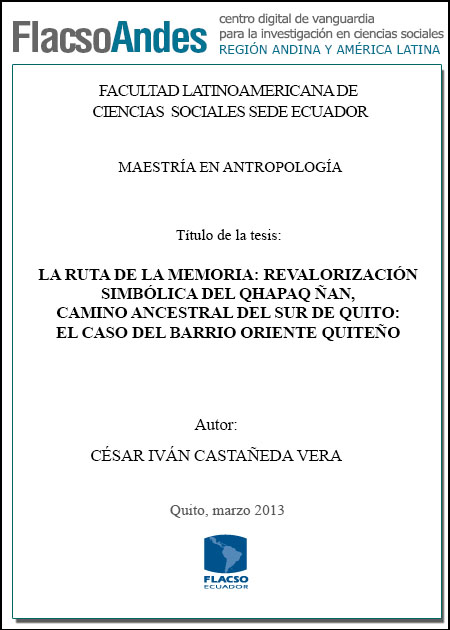 Castañeda Vera, César Iván (2013). La ruta de la memoria : revalorización simbólica del Qhapaq Ñan, camino ancestral del sur de Quito : el caso del barrio oriente quiteño. Maestría en Antropología; FLACSO Sede Ecuador. Quito, 81 p.