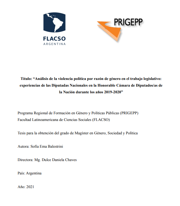 Balestrini, Sofía Ema (2021). Análisis de la violencia política por razón de género en el trabajo legislativo : experiencias de las diputadas nacionales en la Honorable Cámara de Diputados/as de la Nación durante los años 2019 - 2020. Tesis de Maestría. FLACSO. Sede Académica Argentina, Buenos Aires.