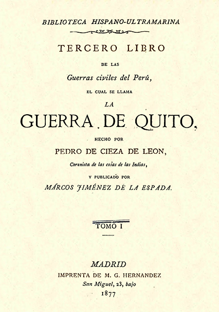 Cieza de León, Pedro de. 1877. Tercero libro de las Guerras civiles del Perú, el se llama la Guerra de Quito. Tomo I. Madrid, España : Imprenta de M. G. Hernandez.