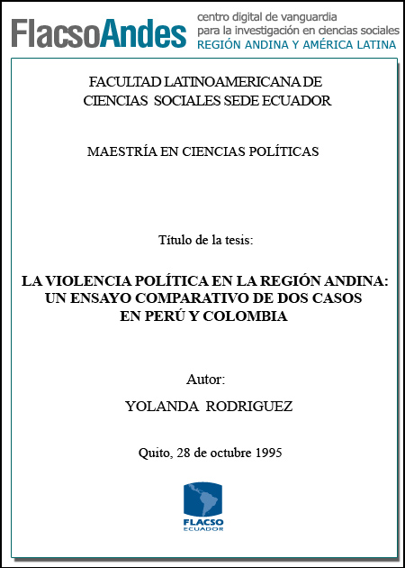 Rodríguez, Yolanda (1995). La violencia política en la región andina: un ensayo comparativo de dos casos en Perú y Colombia. Maestría en Ciencias Políticas; FLACSO sede Ecuador. Quito. 99 p