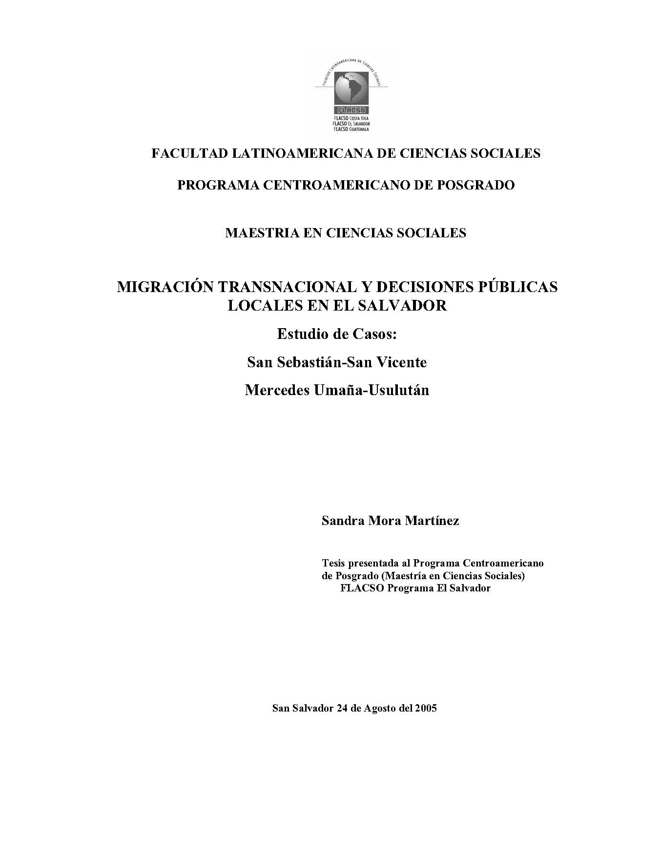 Mora Martínez, Sandra (2005). Migración transnacional y decisiones públicas locales en El Salvador. Maestría en Ciencias Sociales, FLACSO Programa Centroamericano de Postgrado. San Salvador. 139 p.