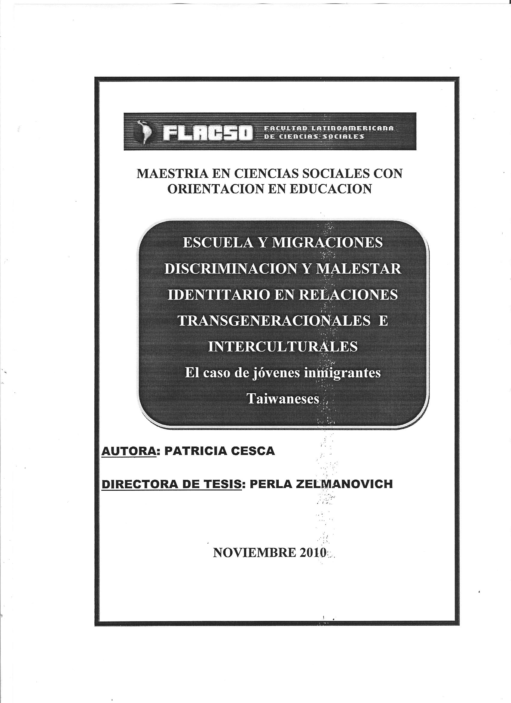 Cesca, María Patricia (2011). Escuela y migraciones, discriminación y malestar identitario en relaciones transgeneracionales e interculturales : el caso de jóvenes inmigrantes taiwaneses. Tesis de Maestría. FLACSO. Sede Académica Argentina, Buenos Aires.