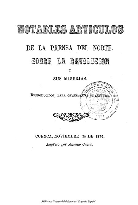 Pánfilo [seud.]. 1876. Notables artículos de la prensa del Norte sobre la Revolución y sus miserias : Reproducidos, para generalizar su lectura. Cuenca : Impreso por Antonio Cueva.