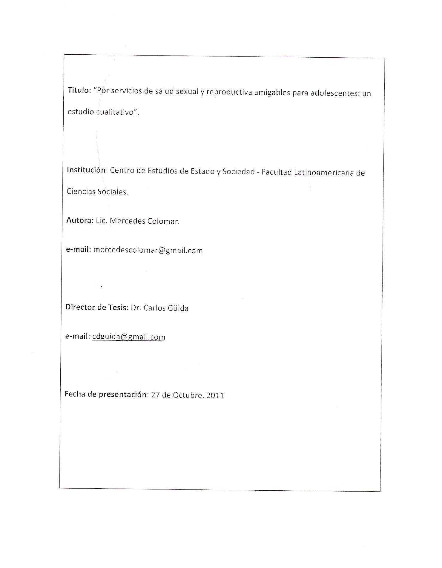 Colomar, Mercedes (2012). Por servicios de salud sexual y reproductiva amigables para adolescentes : un estudio cualitativo. Tesis de Maestría. FLACSO. Sede Académica Argentina, Buenos Aires.