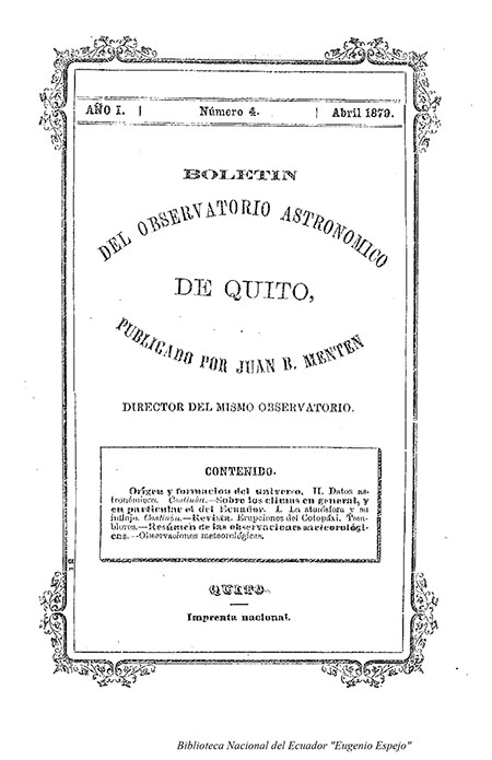 Menten, Juan B. 1879. Boletín del Observatorio Astronómico de Quito 1(4).
